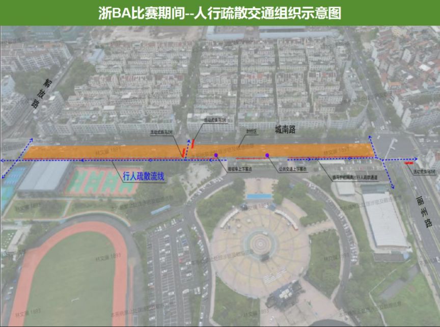1、城南路体育馆旁人行横道设置人行疏散专用通道。