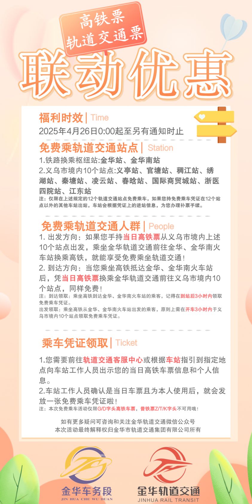 2025年4月26日0:00起(截止时间另行通知),金华市轨道交通集团联合中国铁路上海局集团有限公司金华车务段在义乌地区推出超贴心福利——“当日高铁票享受轨道交通免费接驳服务”。