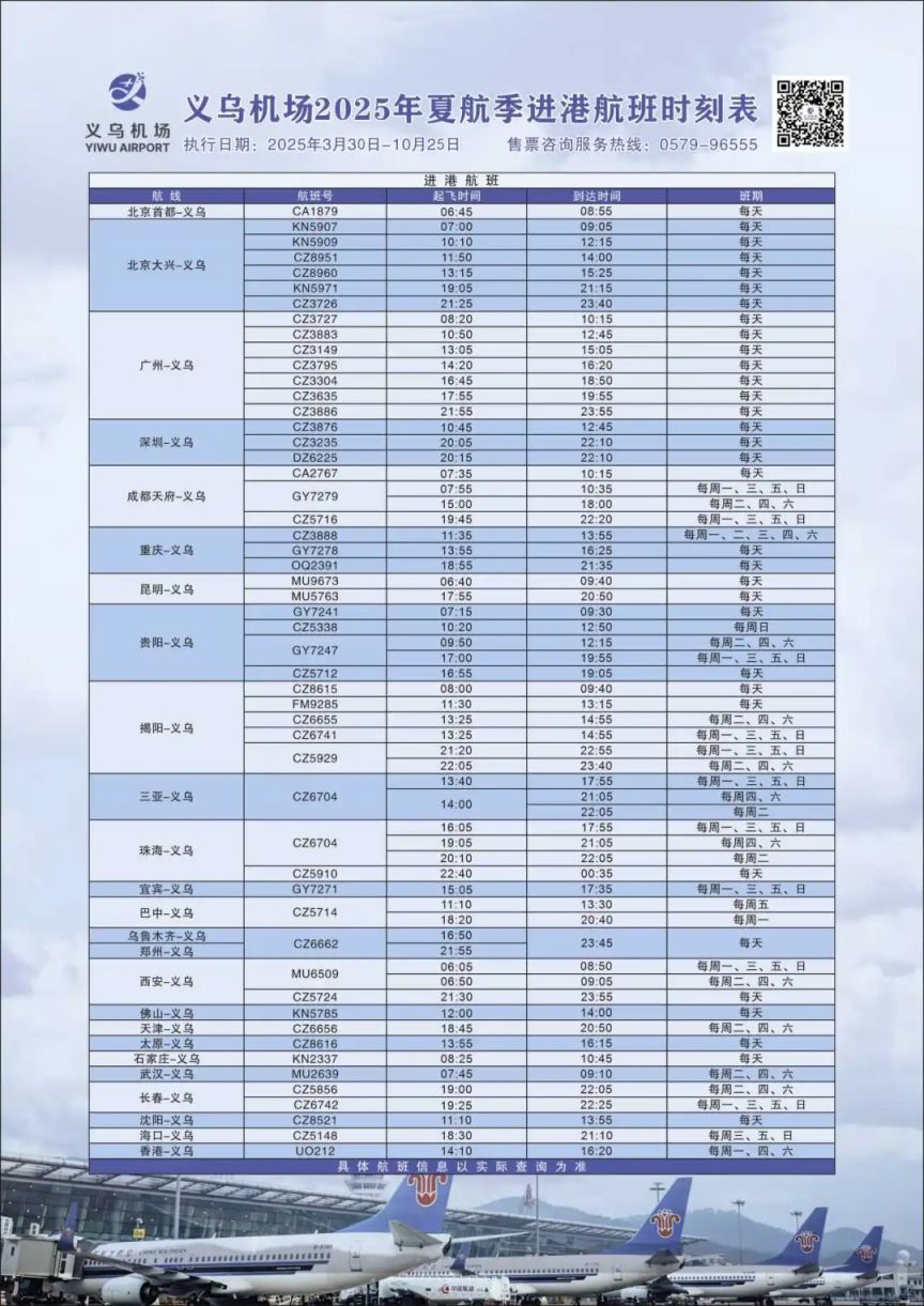 【导语】:2025年3月30日起,义乌机场将执行2025年夏航季航班计划,一起来看看具体航班信息,详见正文。