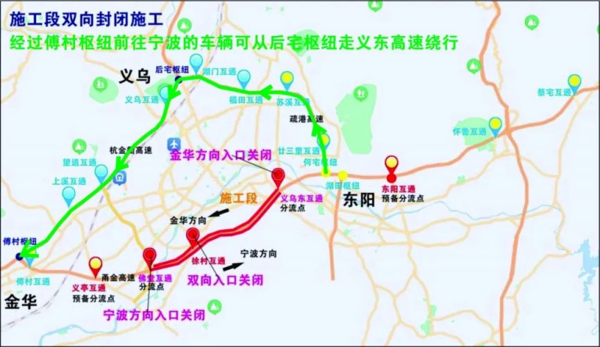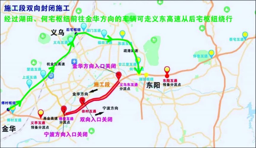 经过湖田、何宅枢纽前往金华方向的车辆可走义东高速从后宅枢纽绕行,避开施工路段。