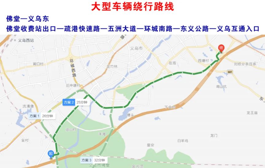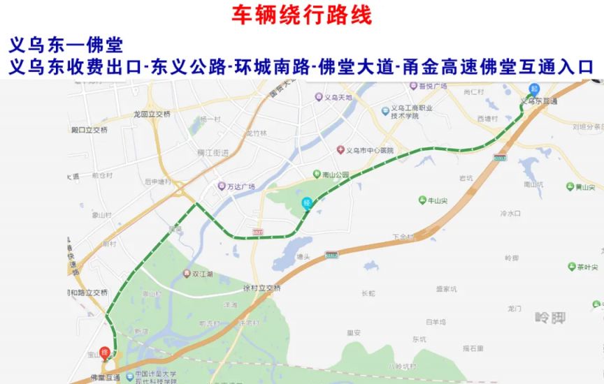 从义乌东互通下来的车辆,可从东义公路-环城南路-佛堂大道-甬金高速佛堂互通入口绕行。